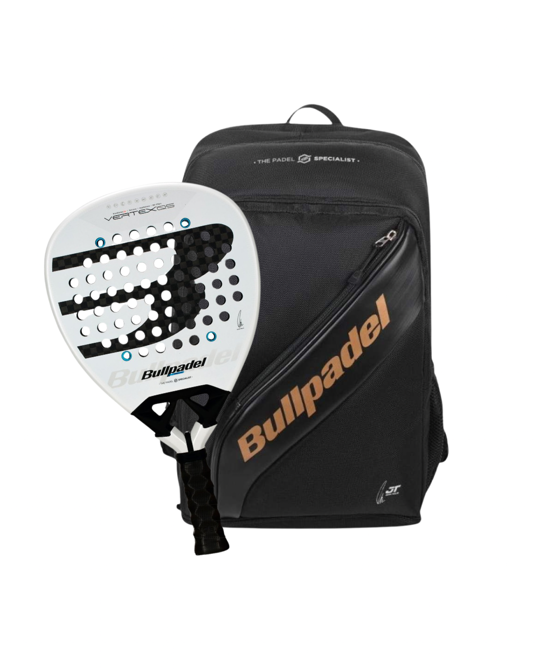 Este combo une la pala Bullpadel Vertex 05 2026, diseñada junto a Juan “El Gato” Tello para ofrecer un equilibrio perfecto entre fuerza, agilidad y control absoluto, con la mochila Bullpadel Vertex Negro, práctica, resistente y con el mismo estilo profesional que distingue al jugador argentino.